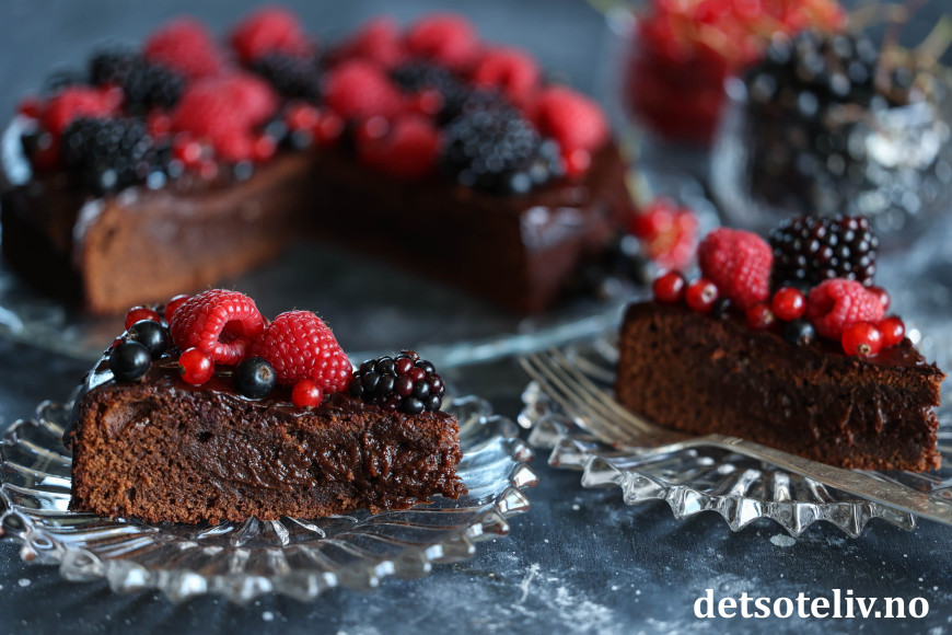 De friske bærene smaker nydelig sammen med den bløte sjokoladekaken.