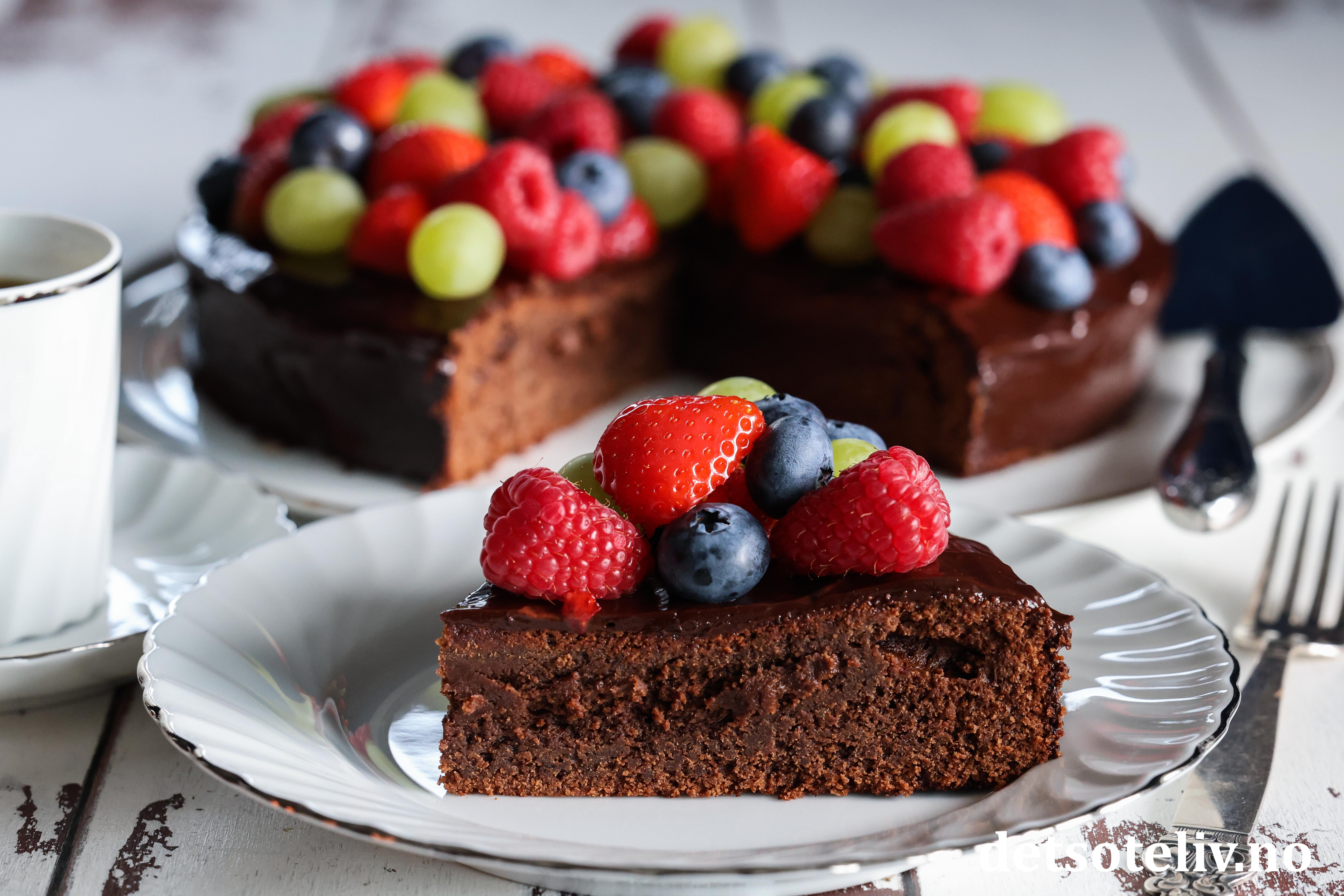 Søte, friske bær er aldri feil sammen med mørk sjokolade. En skvett likør for smakens skyld og noen grønne druer med bærene for fargens skyld, og du har en sjokoladekake som blir uimotståelig