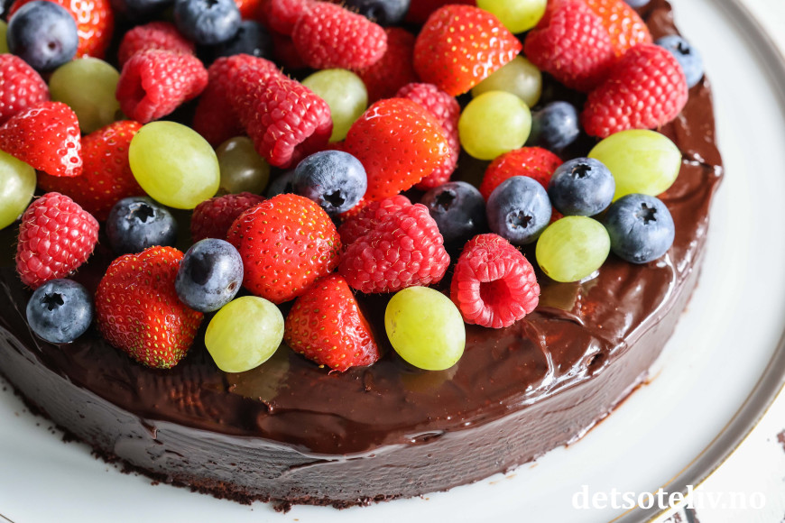 Smør glasuren jevnt over hele kaken. Sett kjølig til glasuren har stivnet. Pynt med bær og druer.