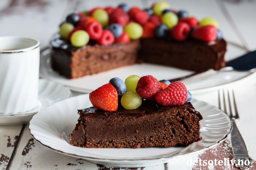 ♥ Ta kaken ut av formen og sett på et fat mens den er kald og stiv. Pynt den så med smeltet sjokoladeglasur som du lar stivne og deretter bær/druer. Server kaken romtemperert, så kjernen inni kaken blir bløt igjen.