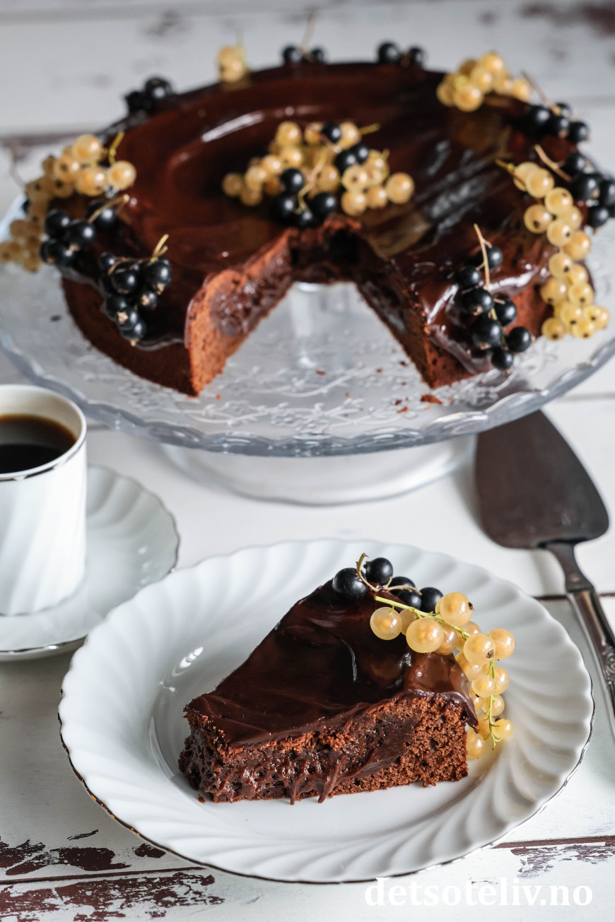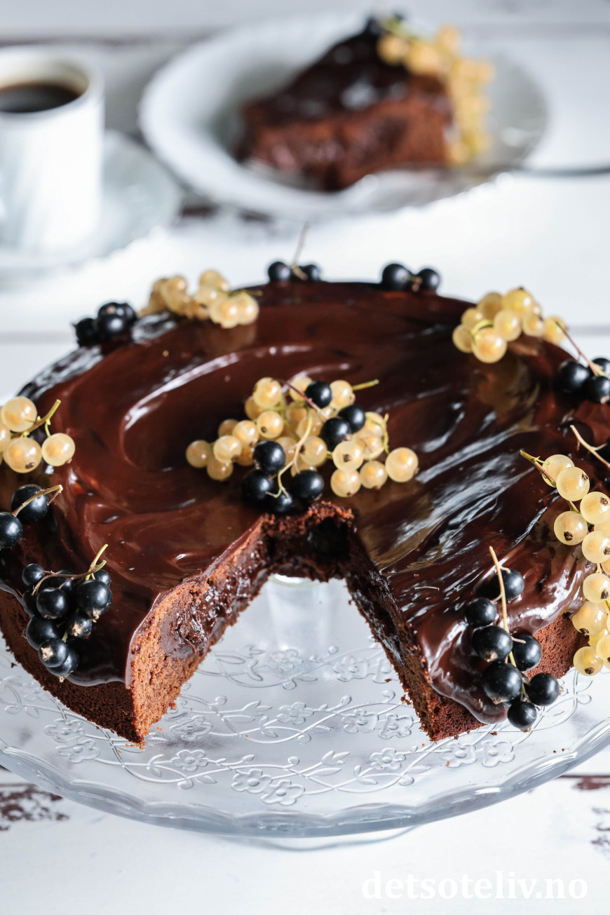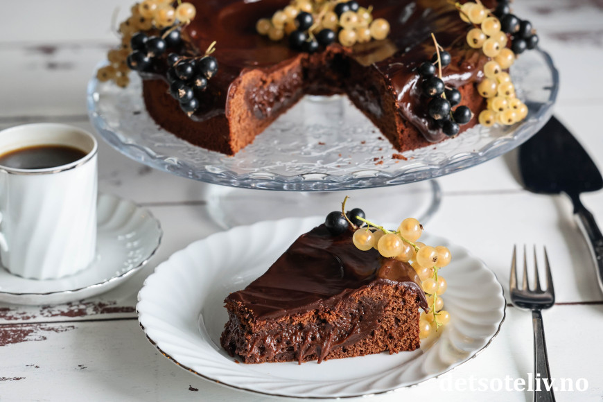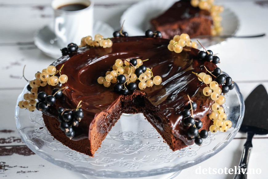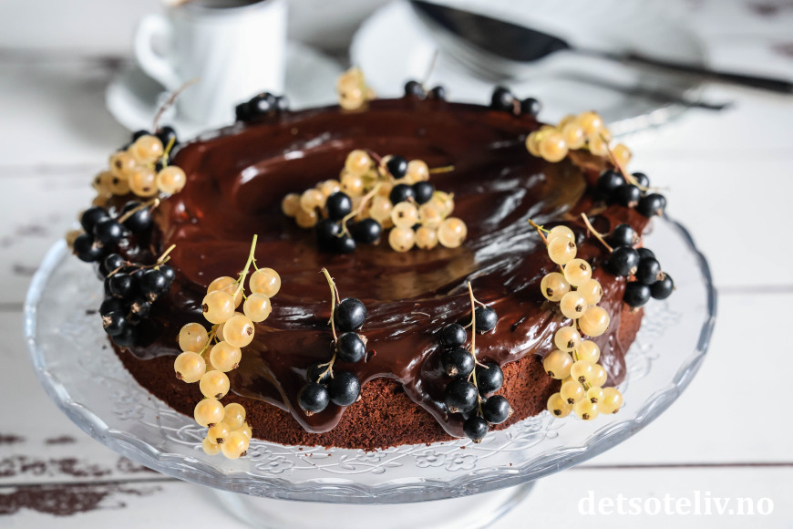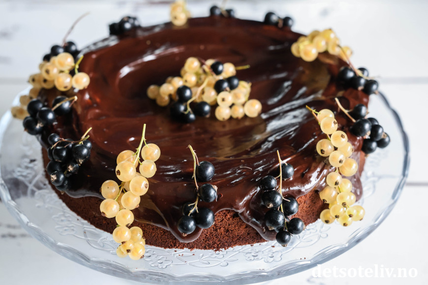 ♥ Ta kaken ut av formen og sett på et fat mens den er kald og stiv. Pynt den så med smeltet sjokoladeglasur og bær. Server kaken romtemperert, så kjernen inni kaken blir bløt igjen.