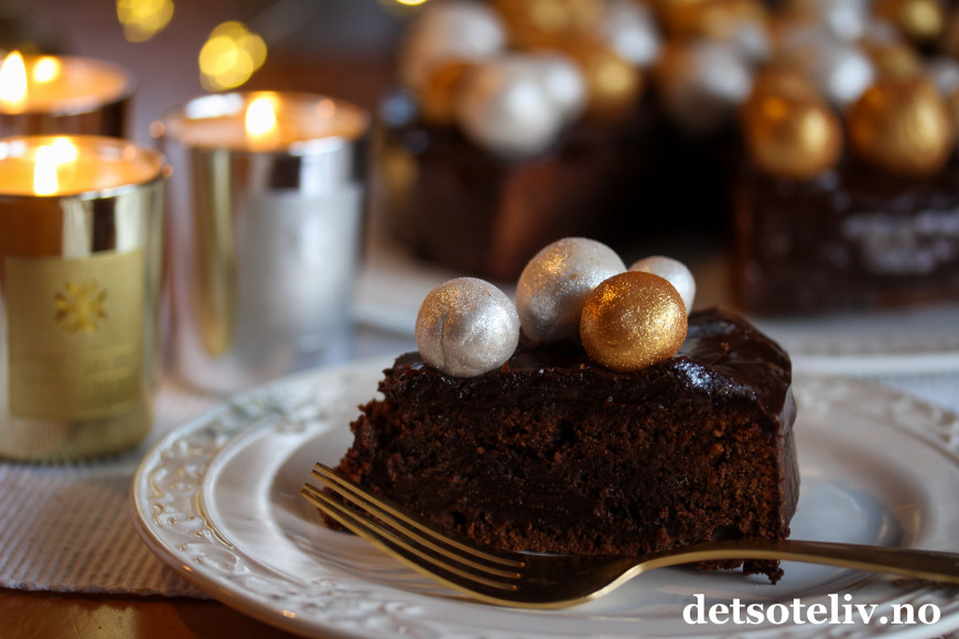 ♥ Som pynt har jeg trillet marsipankuler av hvit marsipan. Hvit marsipan fås kjøpt ferdig (fra Odense) eller du kan bruke hjemmelaget marsipan. Jeg trillet kulene i kakestøv i gull og sølv. Bare ha litt kakestøv i en skål og trill marsipankulene i dette, så fester det seg til kulene. Dette kakestøvet er av merket Mill & Mortar og fås blant annet kjøpt hos Meny. (Og for ordens skyld: Dette er ikke et betalt innlegg selv om jeg gir produktomtale.)