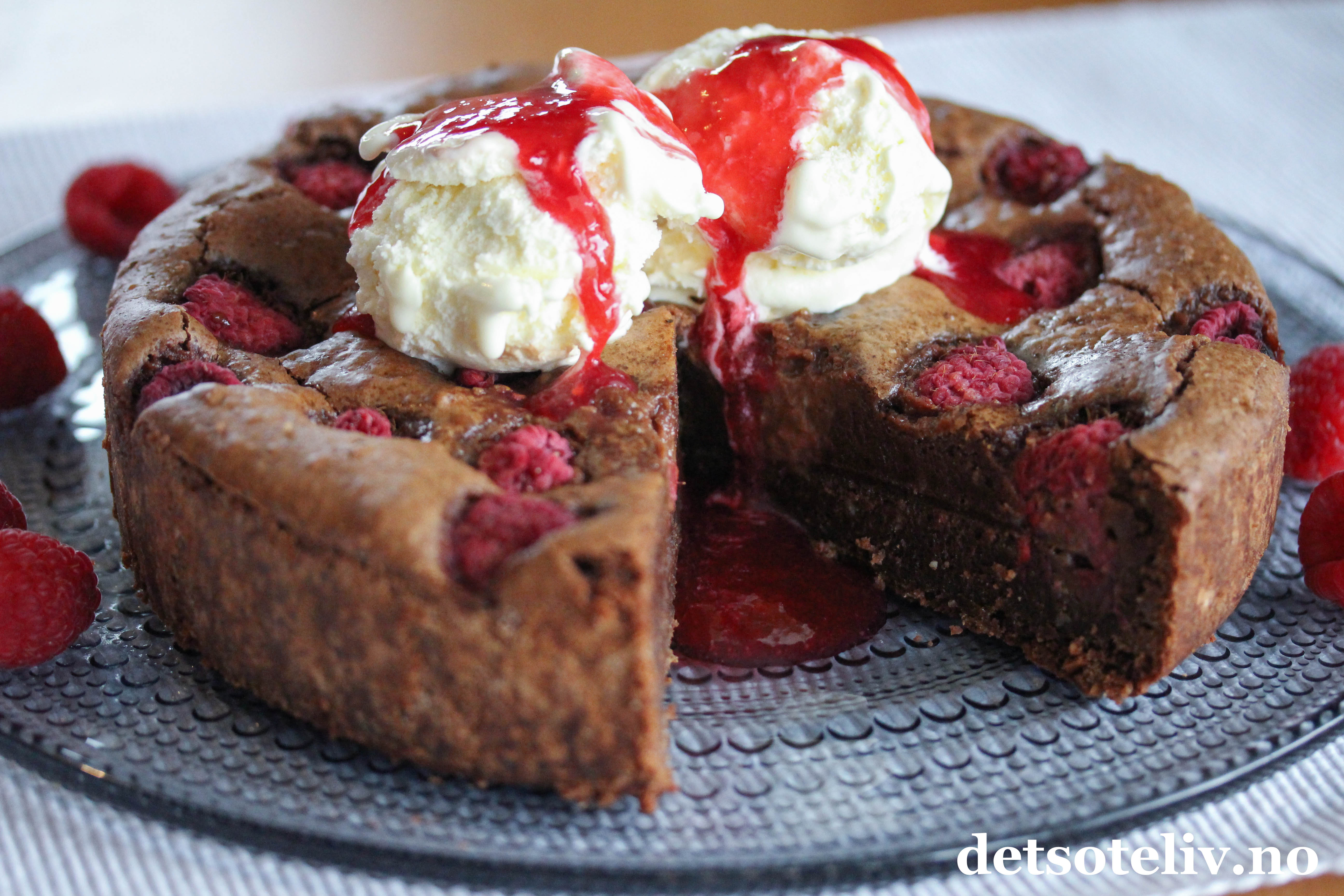 Server kaken gjerne med vaniljeis og hjemmelaget bringebærsaus (se tips).