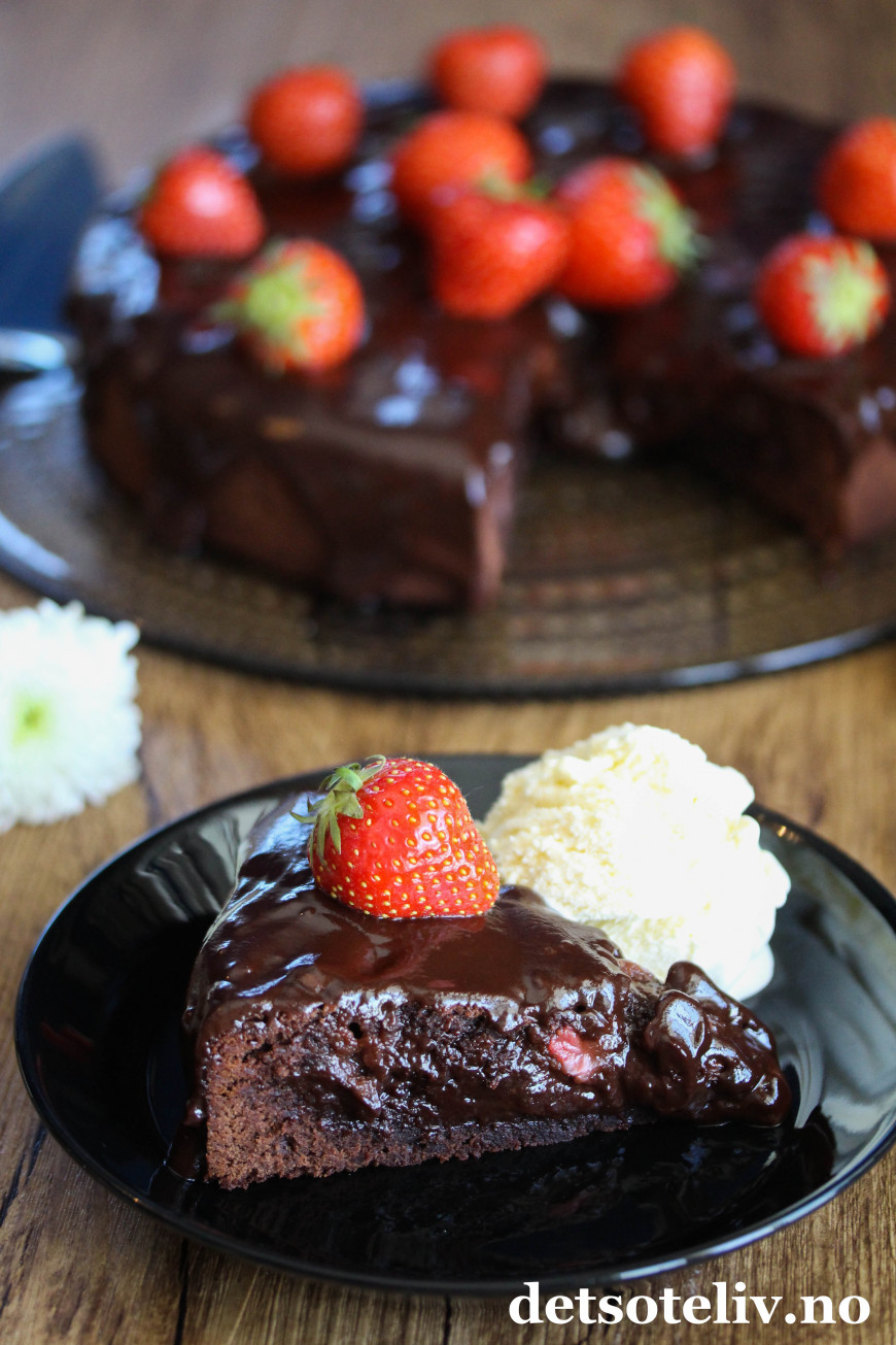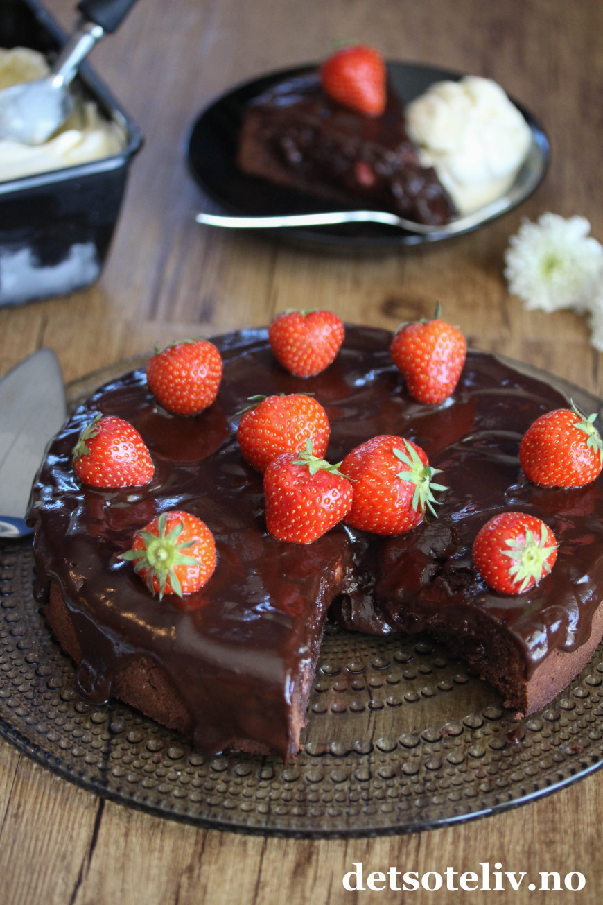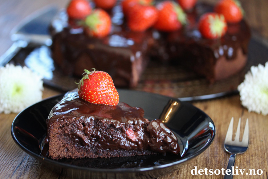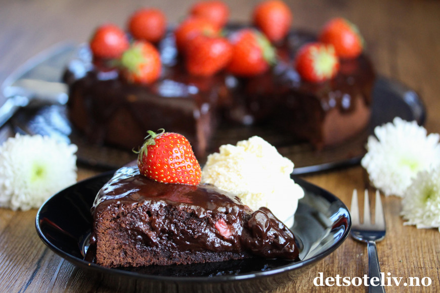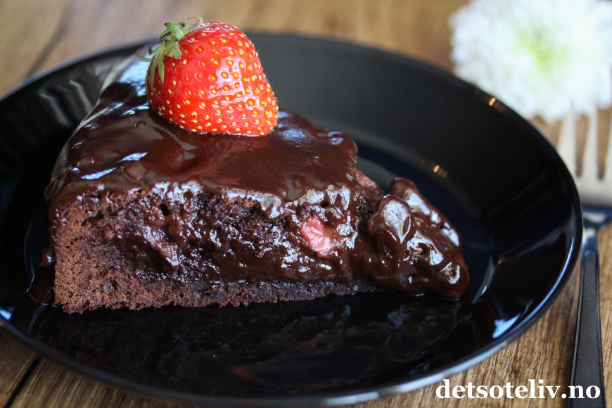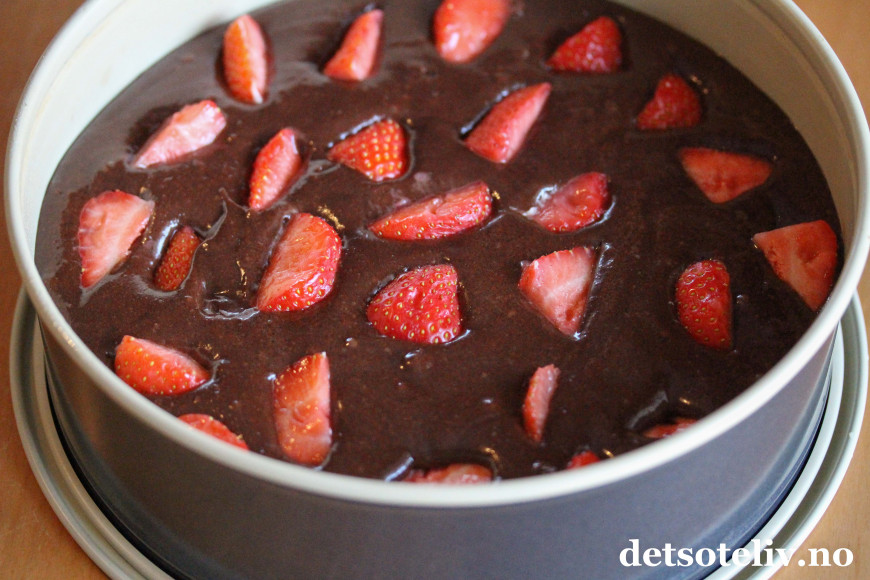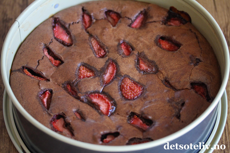 En mørk, fuktig konfektkake blir sommerlig og ekstra god med friske jordbær i deigen.