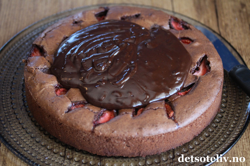 Jeg pynter med sjokoladeglasur og friske jordbær for å gjøre kaken enda friskere og for å gi vakker farge til kaken.