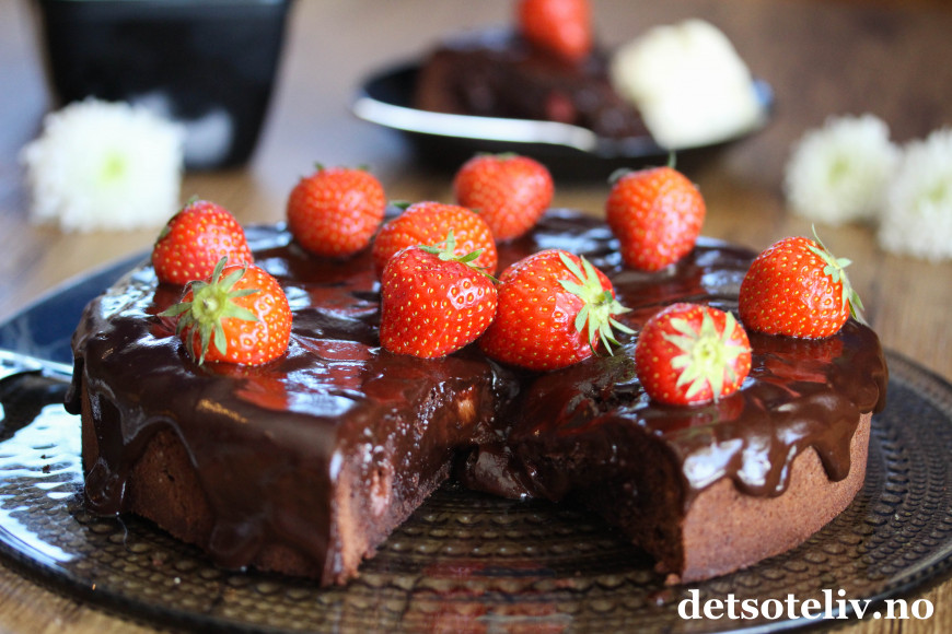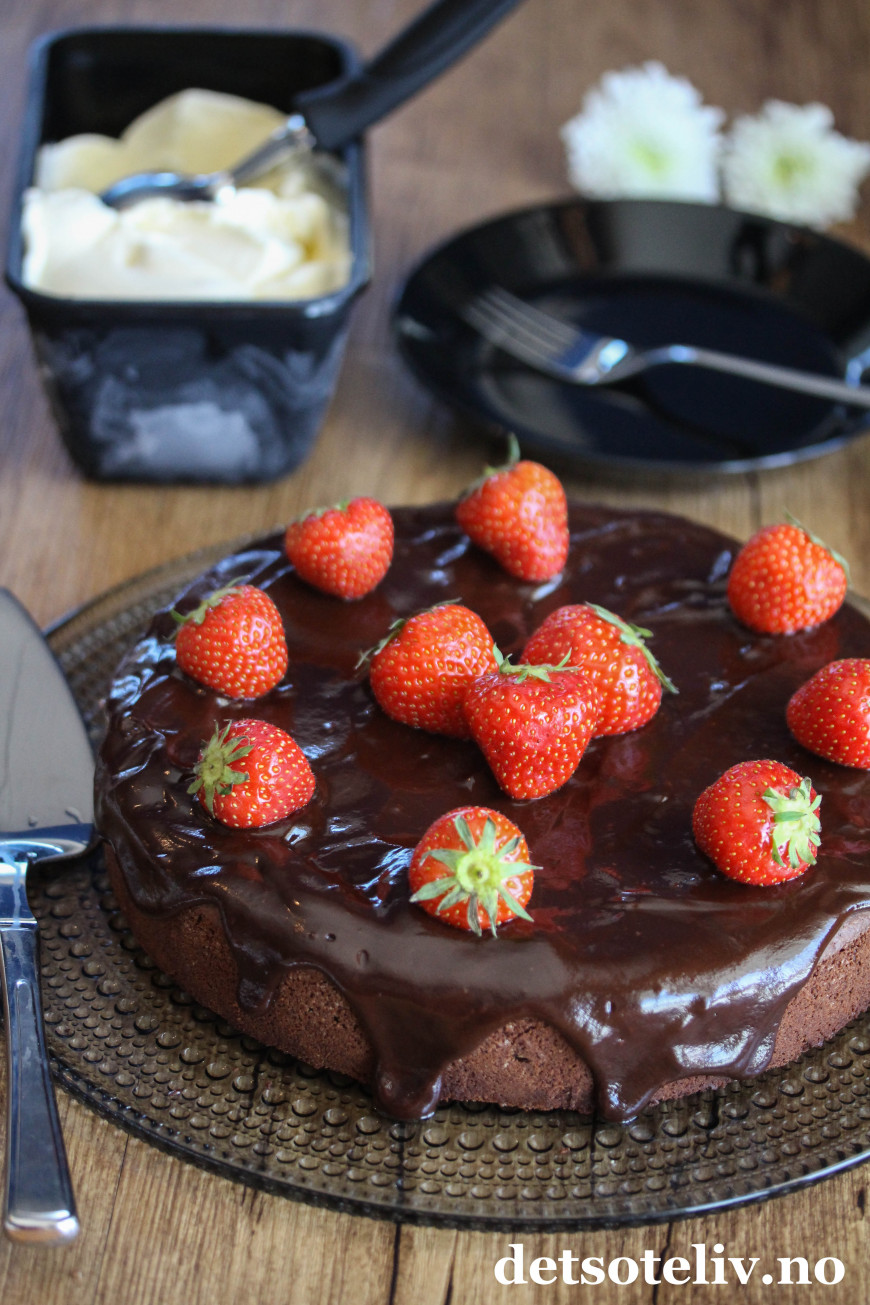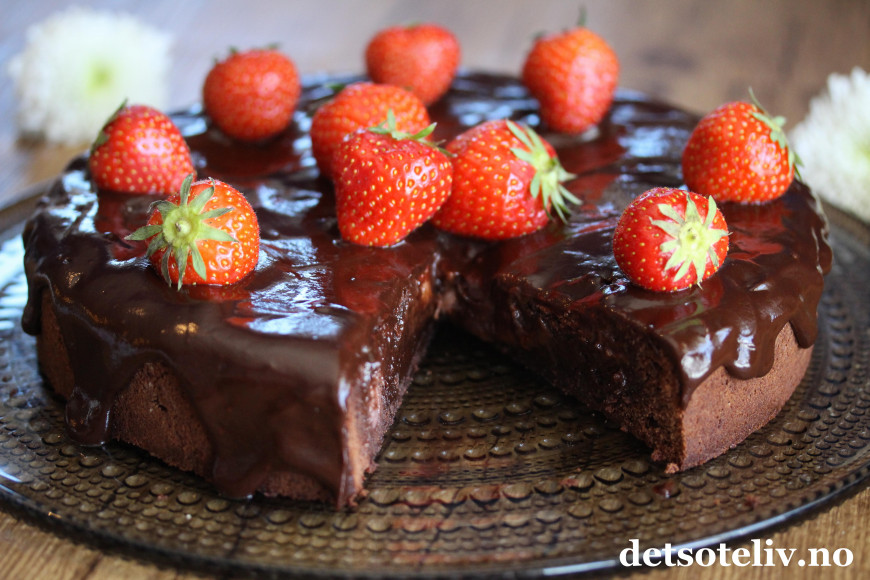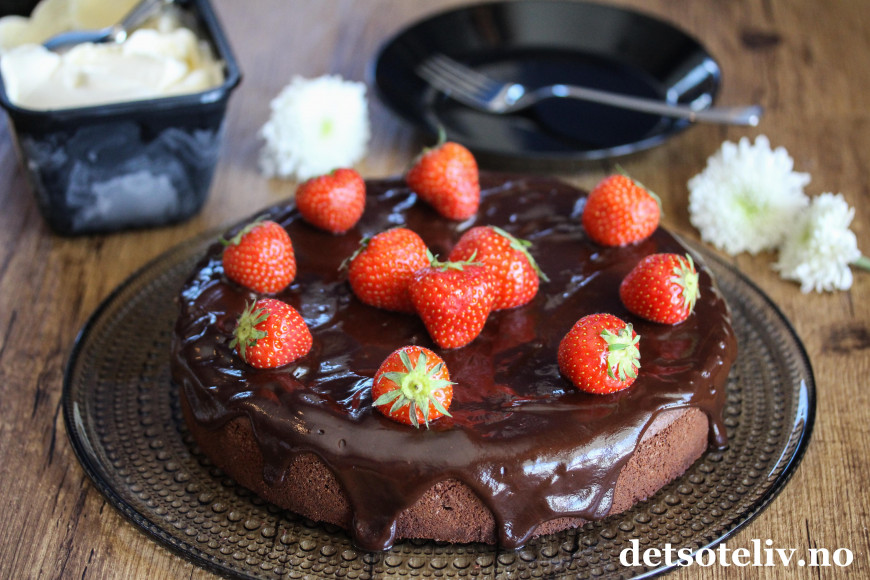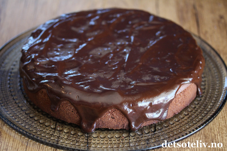 Sjokoladeglasuren kan gjerne renne litt ned langsmed kanten av kaken.