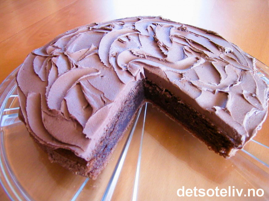 Rør sammen romtemperert smør, kakao og melis. Smør sjokoladekremen på toppen av kaken.