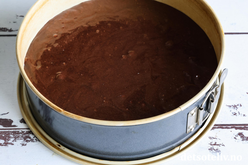 Ha deigen i en rund form (24 cm i diameter) med bakepapir i bunnen.