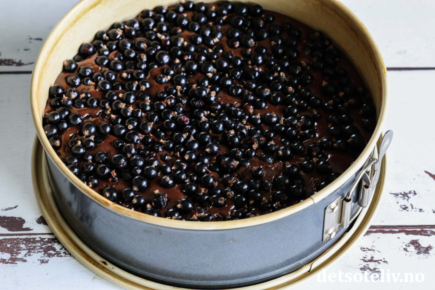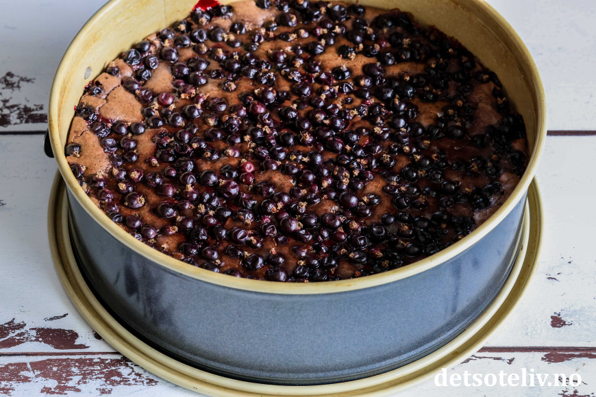 Ha deigen i en rund form (24 cm i diameter) med bakepapir i bunnen. Legg solbærene oppå deigen og trykk de litt ned i deigen.