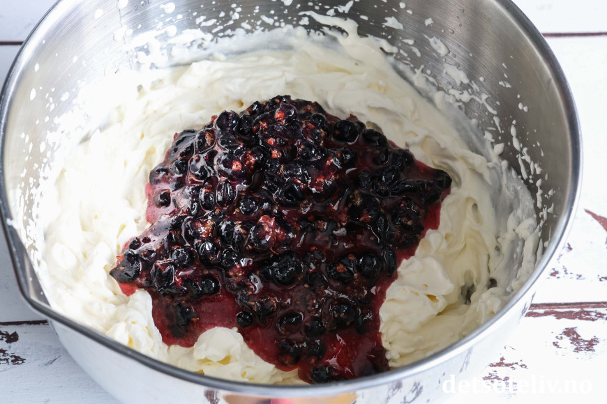 Pisk kremfløten til fast krem. Vend solbærmosen forsiktig sammen med kremen.