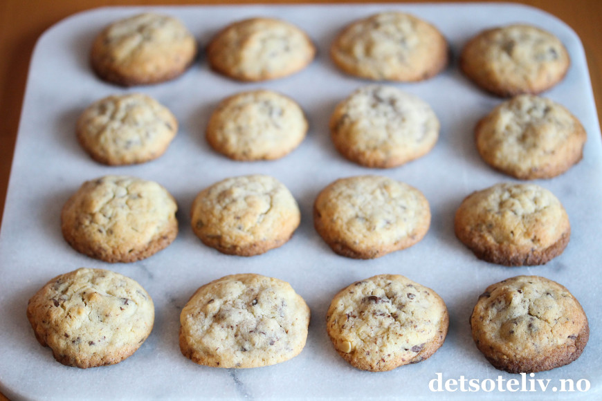 Sett små topper av deigen med to teskjeer på bakepapirdekkede stekeplater. Beregn litt avstand mellom kakene, for kakene skal flyte litt utover under stekingen. Stek kakene midt i ovnen ved 200°C i ca. 10 minutter. Kakene skal være lett gylne i kantene. Avkjøl kakene en stund på platen før de forsiktig flyttes over på rist og avkjøles helt.
