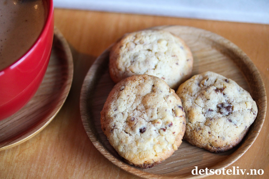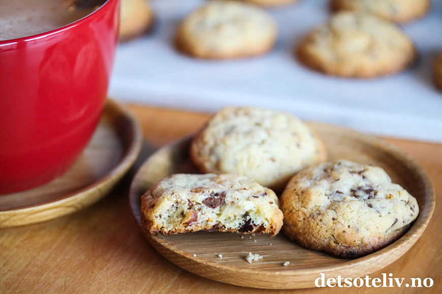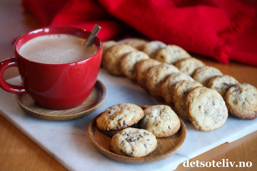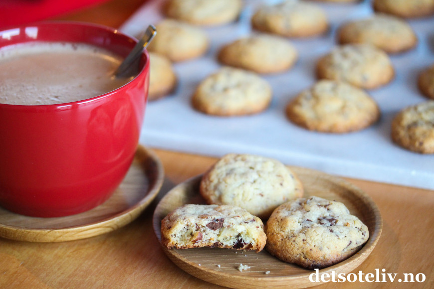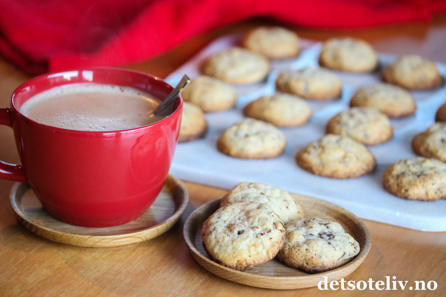 ♥ Du kan variere kjeksene ved å bytte kokesjokoladen med melkesjokolade. Hasselnøttene kan byttes ut med mandler eller andre typer nøtter.