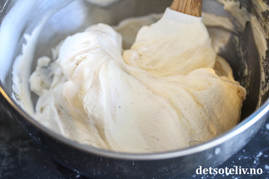 Pisk kremfløten sammen med vaniljesukker og melis til du får en tykk og fløyelsmyk fløtekrem.