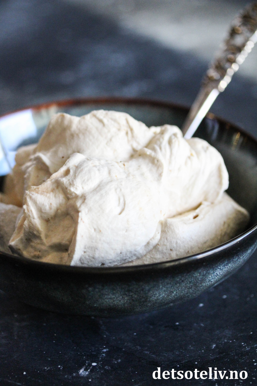 ♥ Denne kremen er supernydelig å servere sammen med Karamellpudding. I så fall kan du gjerne også vende inn 1 spiseskje karamellsaus i kremen. Det gjorde jeg her, og det ble veldig godt.
