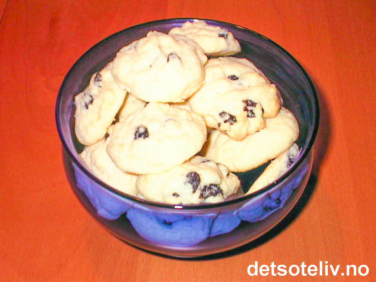 Sett topper av deigen på bakepapirkledde stekeplater ved hjelp av to teskjeer. Stek kakene midt i ovnen ved 175°C i ca 10 min. Avkjøl kakene på rist.