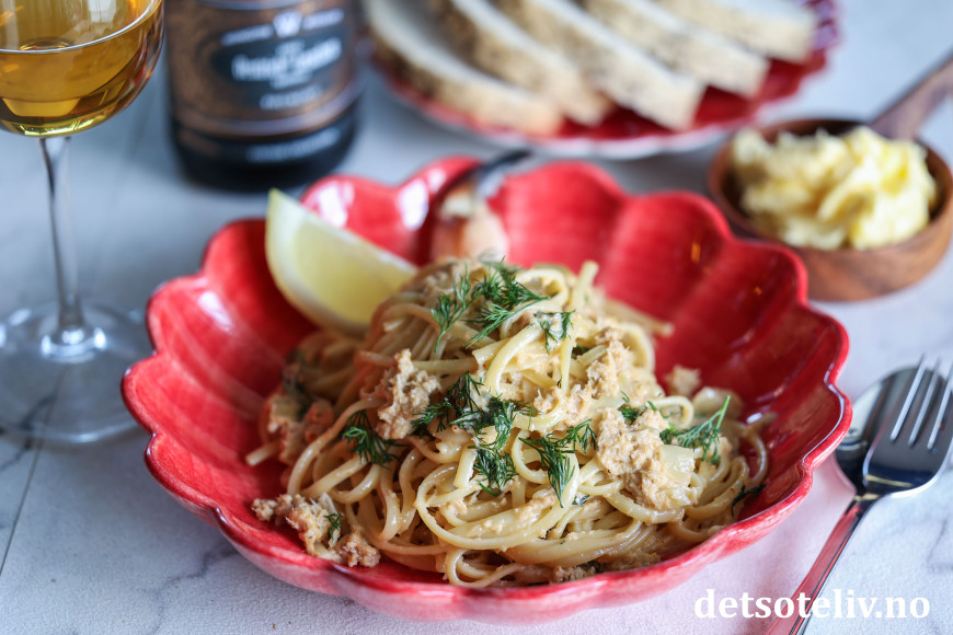 Server krabbepastaen gjerne med godt brød og smør ved siden av.