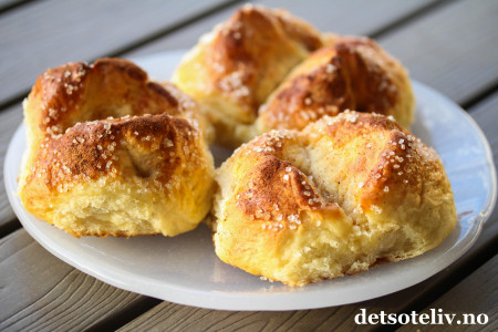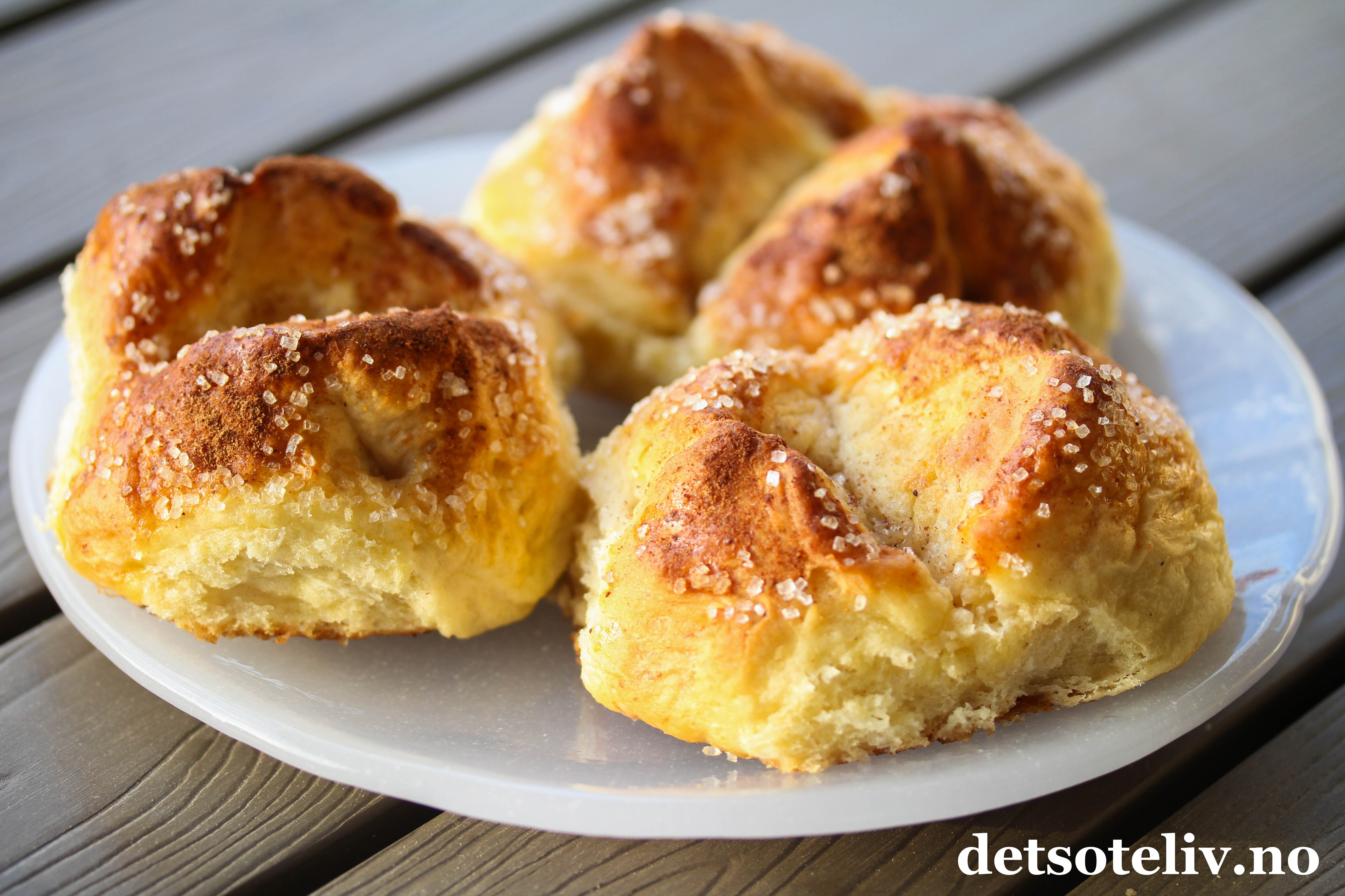 Pensle først over bollene med sammenpisket egg. Bruk så en saks og klipp et nokså dypt kryss på toppen av hver bolle. Dryss først godt med kanel, legg så på en smørklatt (press den litt ned i gropen) og strø over perlesukker til slutt.