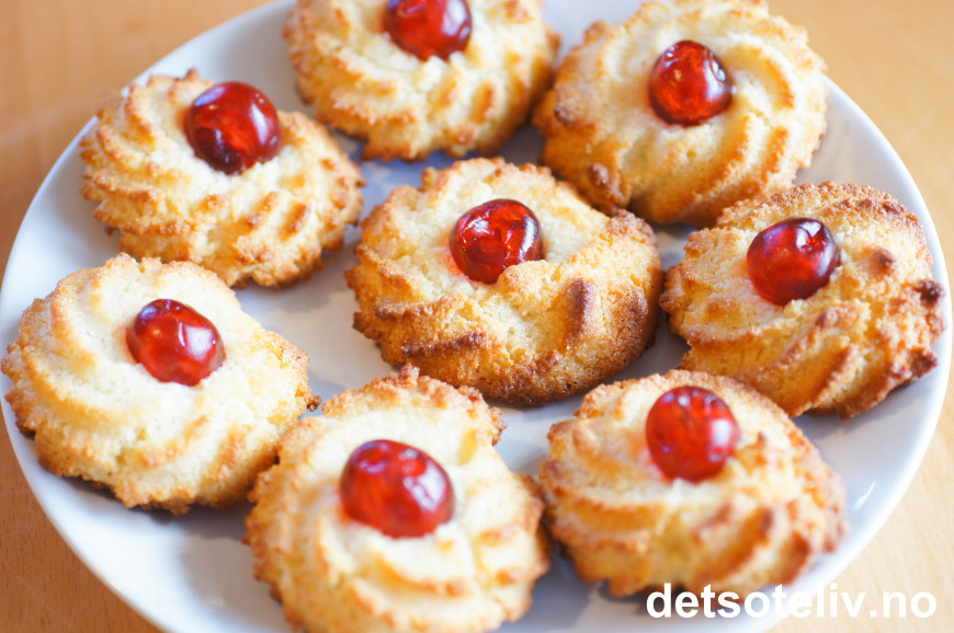 Sprøyt kransekakemassen ut til små topper eller lag litt større kranser som jeg har gjort her. Det er lettere å lage kranser om du bruker den sprøyteklare kransekakemassen.