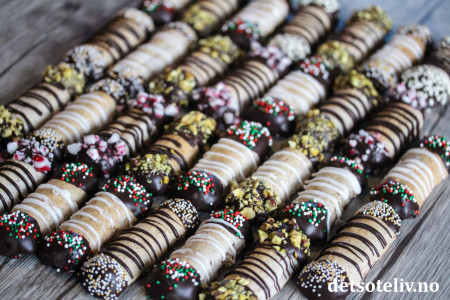 Legg stengene på brett som er dekket med bakepapir og sett dem i kjøleskapet til sjokoladen har stivnet.