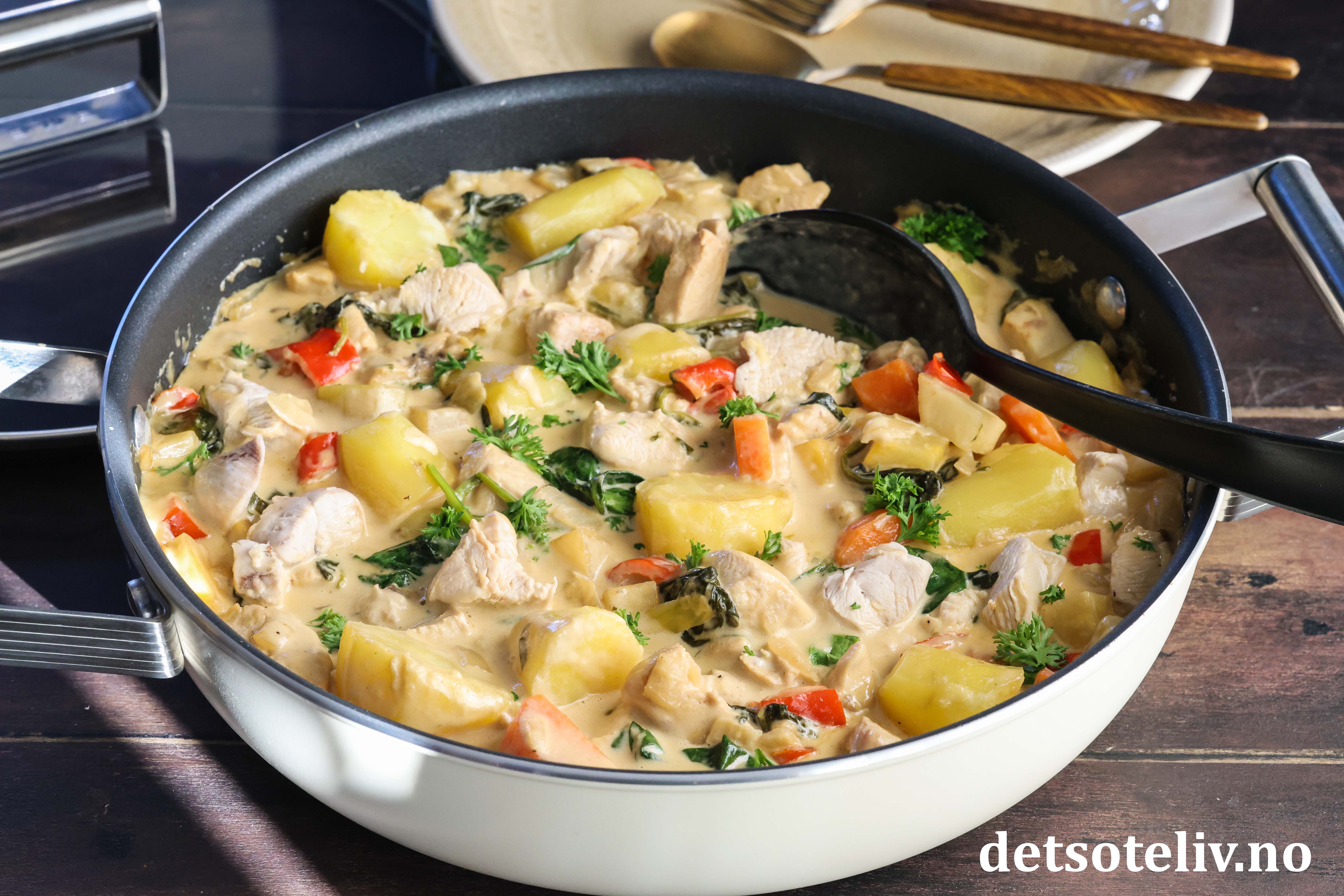 Dette er en deilig "alt-i-ett" (one pot)-gryte med kylling, poteter, rotgrønnsaker, paprika og spinat.