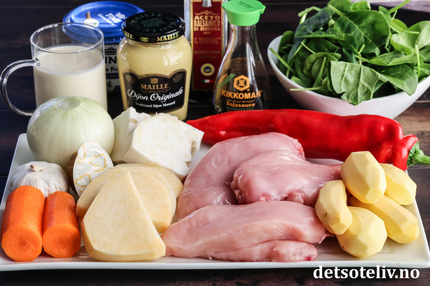 Rør inn crème fraîche, kyllingfond og vann. Smak til sausen med dijonsennep, soyasaus, balsamicoeddik, kvernet salt og pepper. La gryten småkoke i et par minutter, til rotgrønnsakene er helt møre. Juster eventuelt tykkelsen på sausen med litt mer vann.