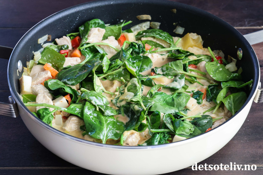 Skjær paprika i biter og ha i pannen sammen med spinatbladene. Hell på fløten og la dette surre på middels varme i noen minutter. Du vil etter hvert se at spinatbladene klapper sammen og reduseres i volum.