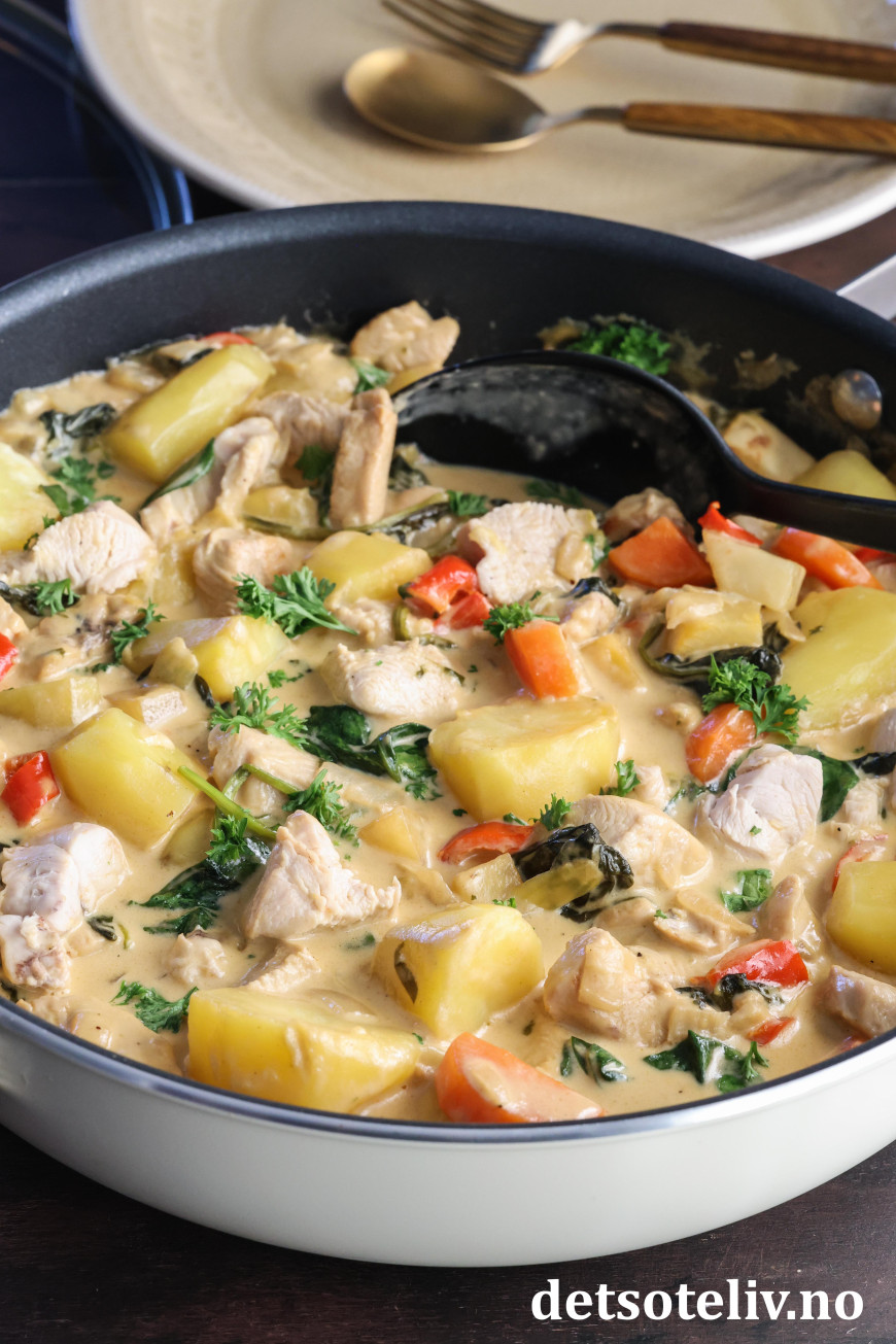 Helt til slutt vendes de store, ferdigkokte potetbitene inn i gryten. La det hele varmes opp sammen. Dryss på litt kruspersille og server kyllinggryten varm og nylaget!