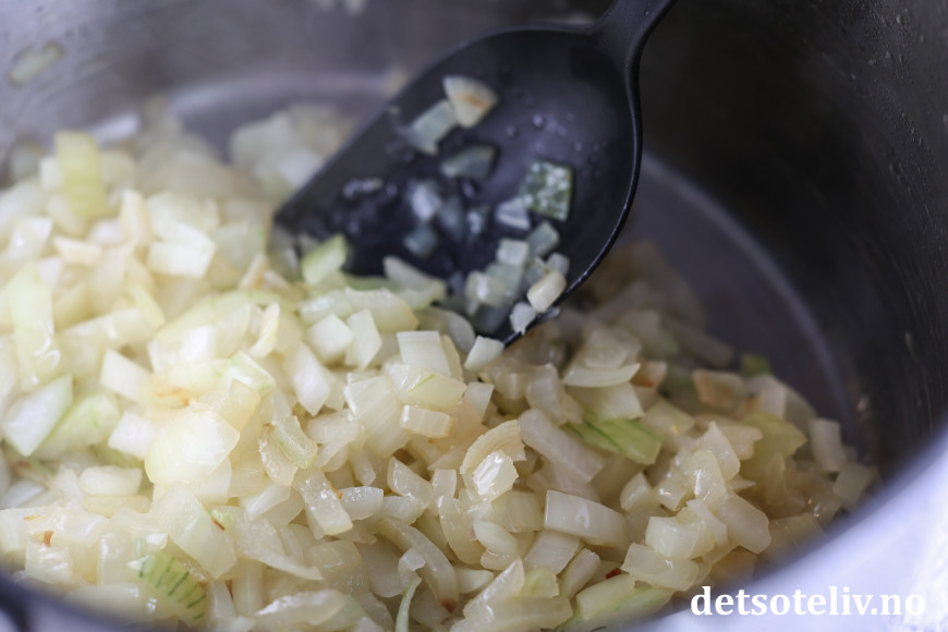 Hakk løk og hvitløksfedd og ha dette i en stor kjele sammen med olje. La dette surre på middels varme i et par minutter så løken blir myk og gyllen.