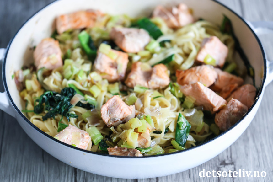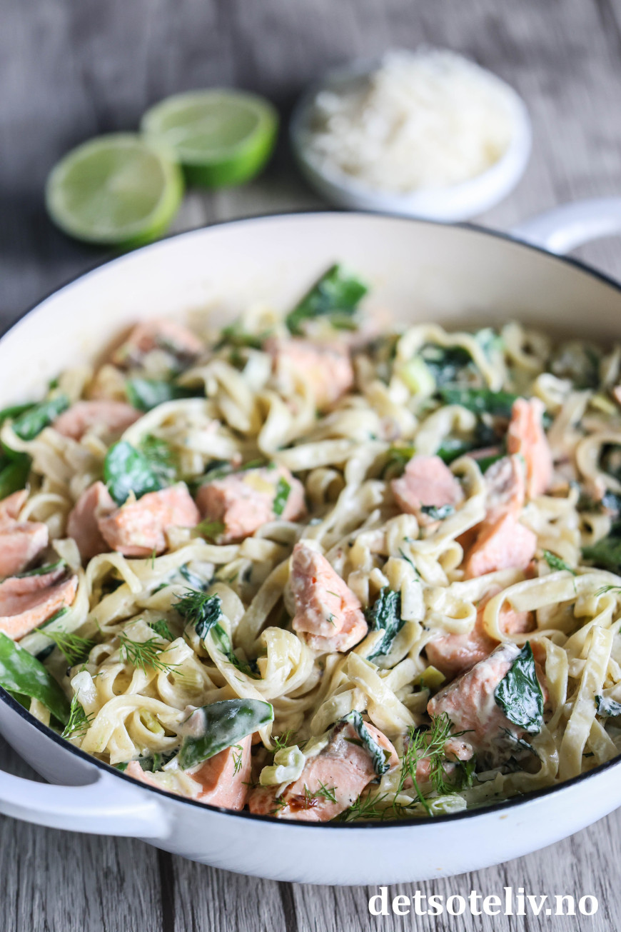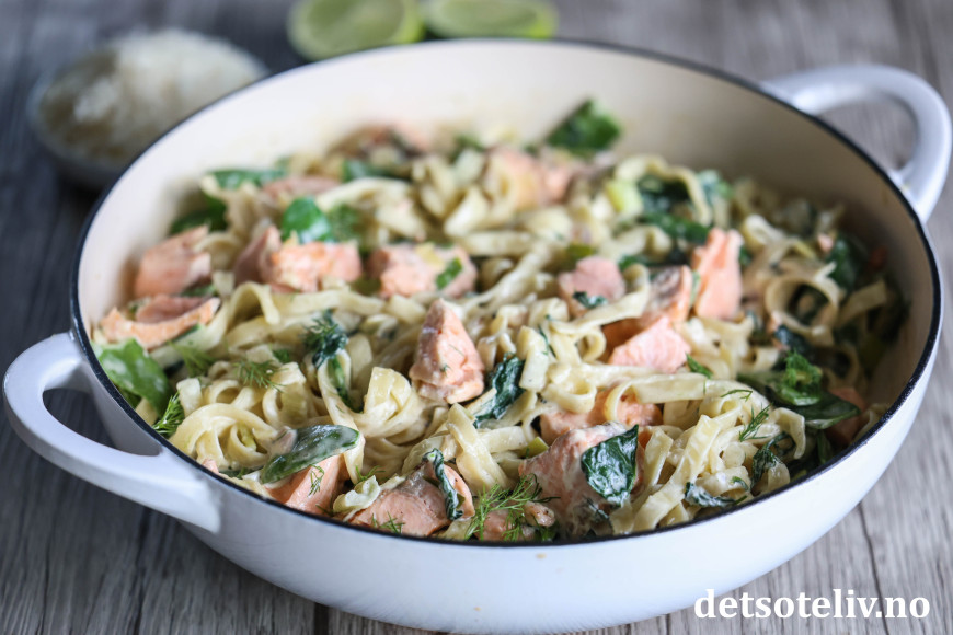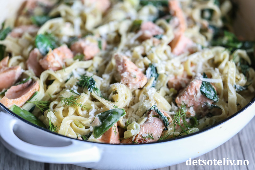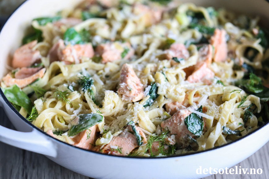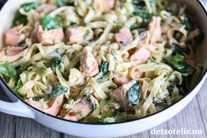 Her har du en populær middag med pasta og laks i en nydelig, kremet saus, som lages med fløte, løk, crème fraîche og parmesan!