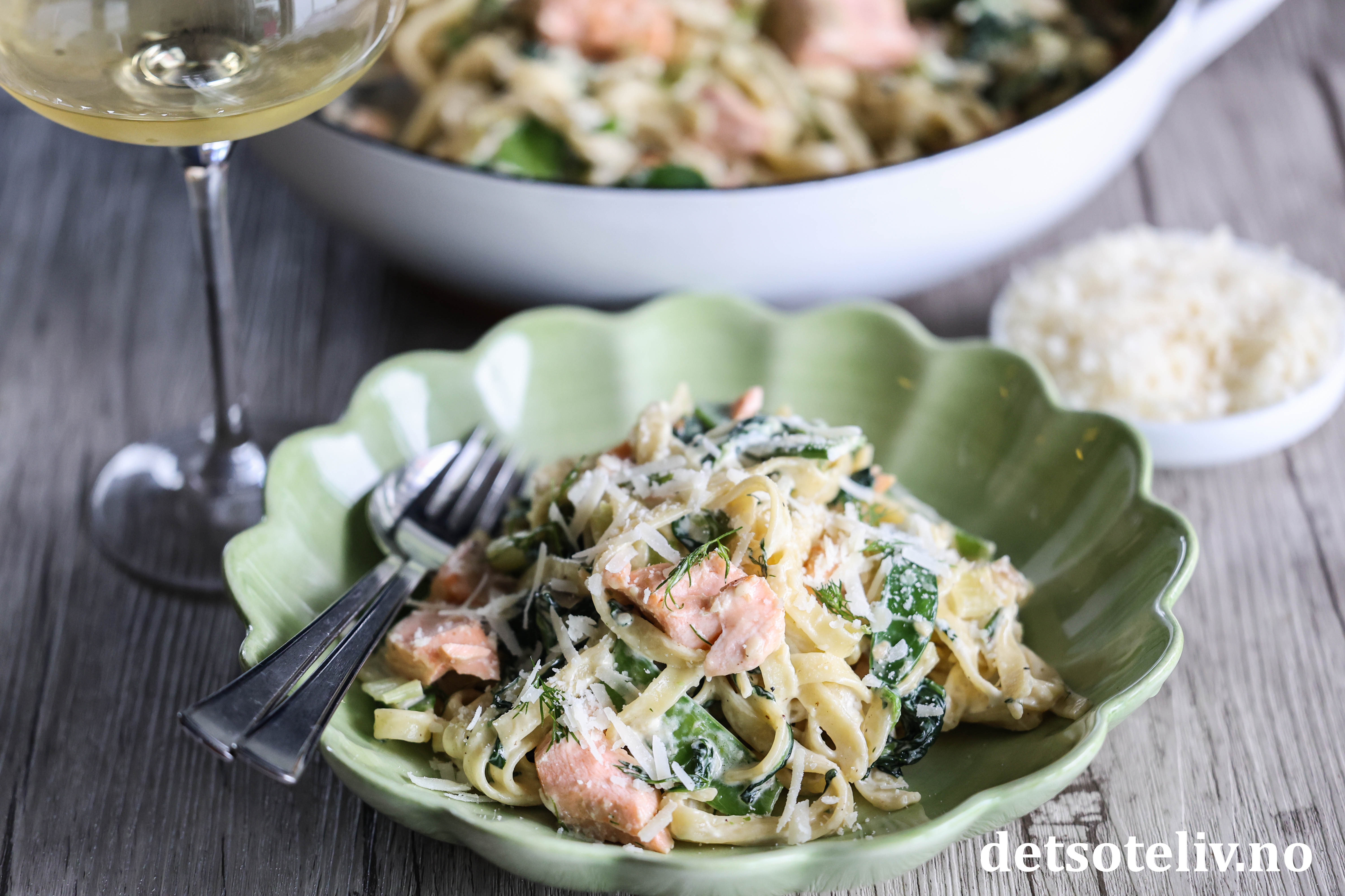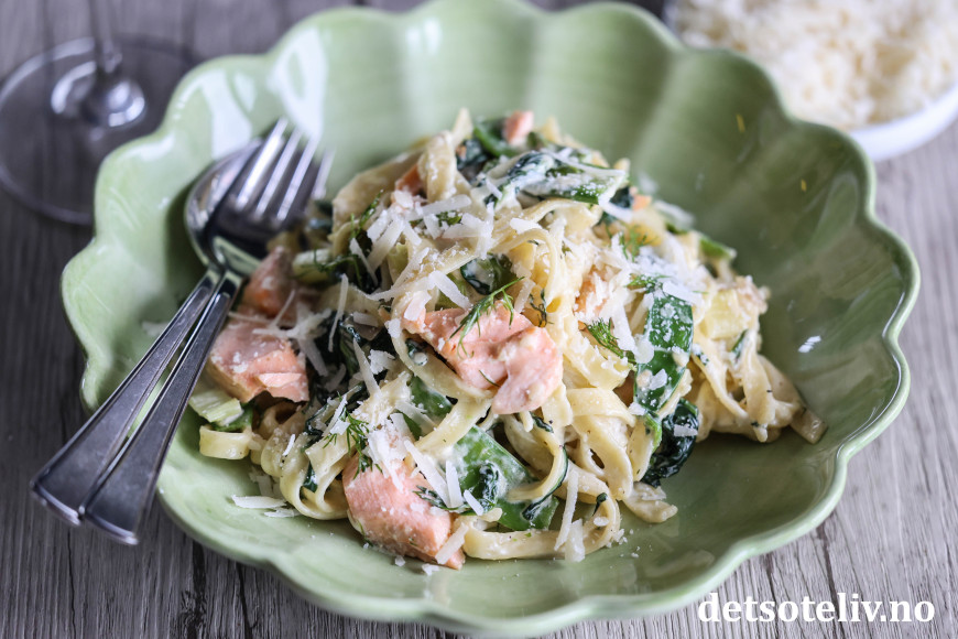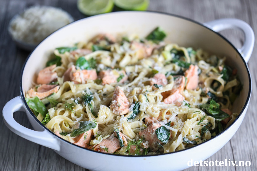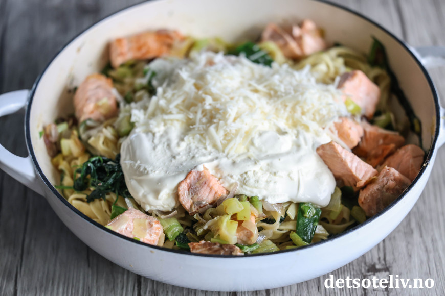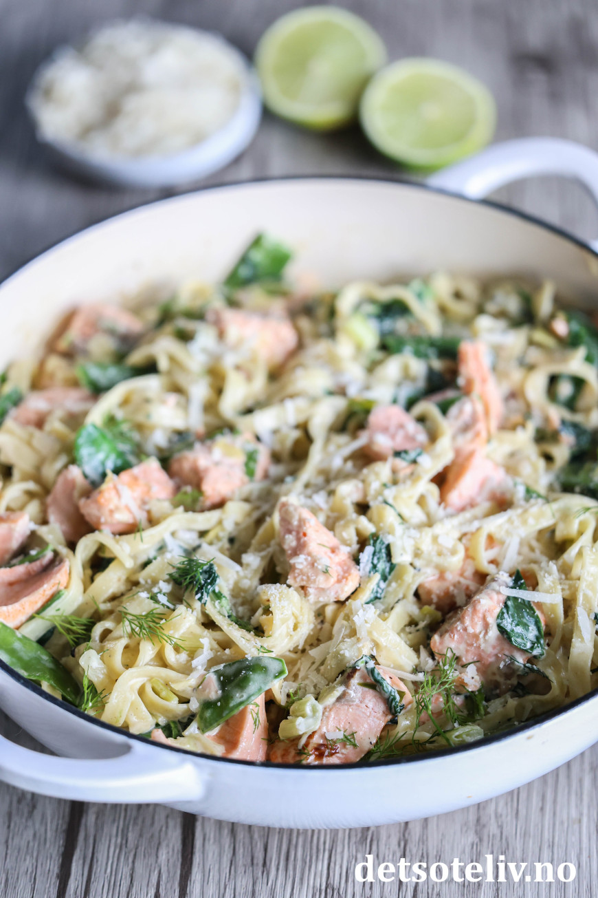 Her har du en populær middag med pasta og laks i en nydelig, kremet saus, som lages med fløte, løk, crème fraîche og parmesan!