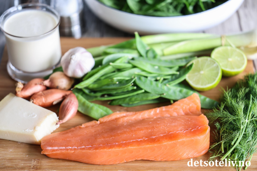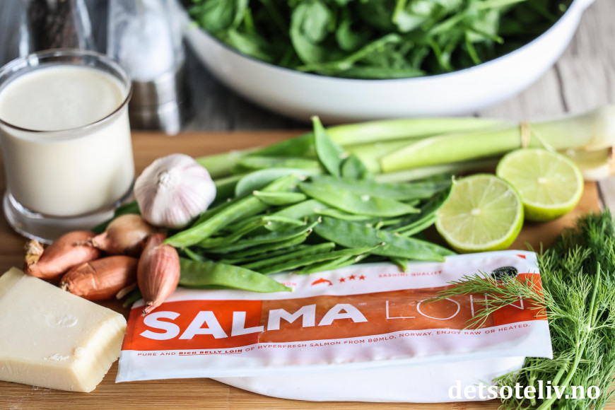 ♥ Jeg har her brukt ren laksefilet (belly loin, som er bukstykket på laksen). Det går fint å bruke annen laksefilet.