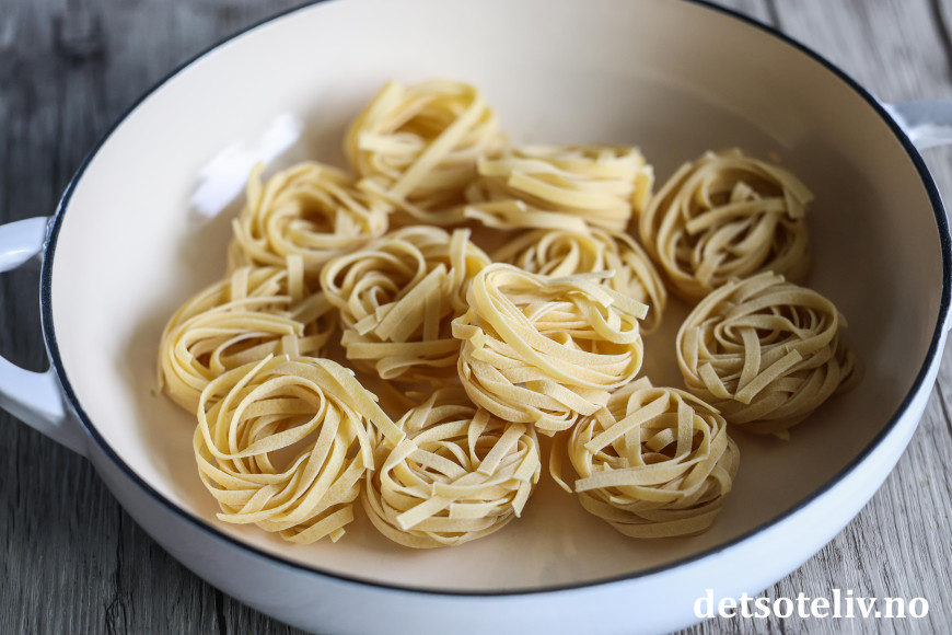 ♥ Båndspagetti (tagliatelle) kan byttes ut med andre varianter av pasta, for eksempel pastarør (penne) eller pastasløyfer (farfalle).