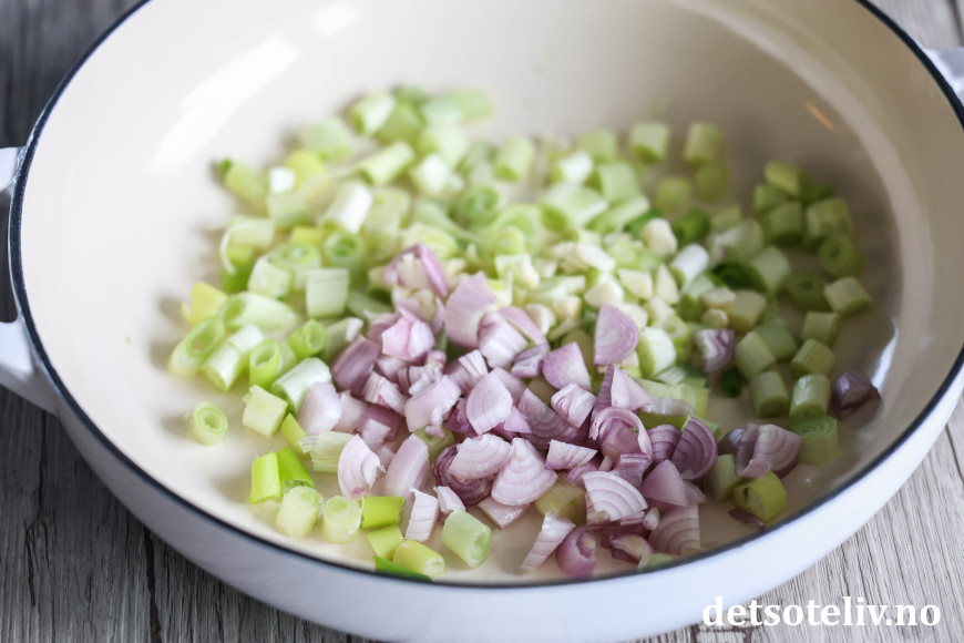Bruk en stor panne med litt høye kanter (eller en kjele). Smelt smøret og tilsett fint hakket sjalottløk, hvitløk og vårløk. La dette steke på middels varme i et par minutter.