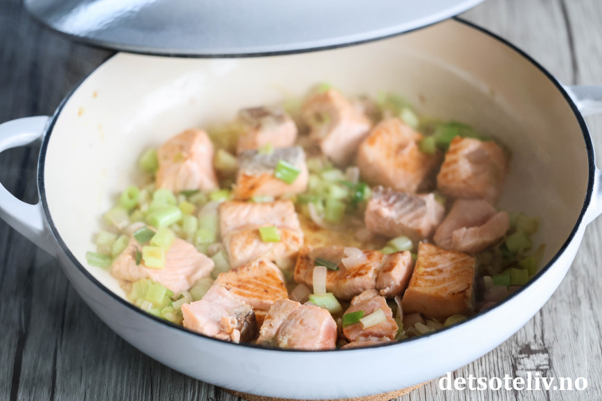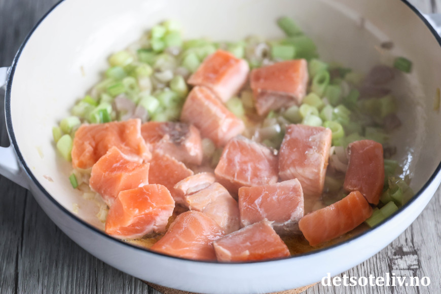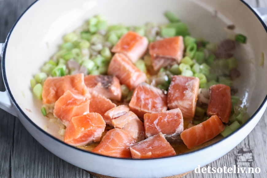 Skjær laksefileten i store terninger. Ha disse i pannen og la de steke med løken i 1 - 2 minutter.