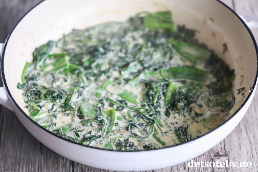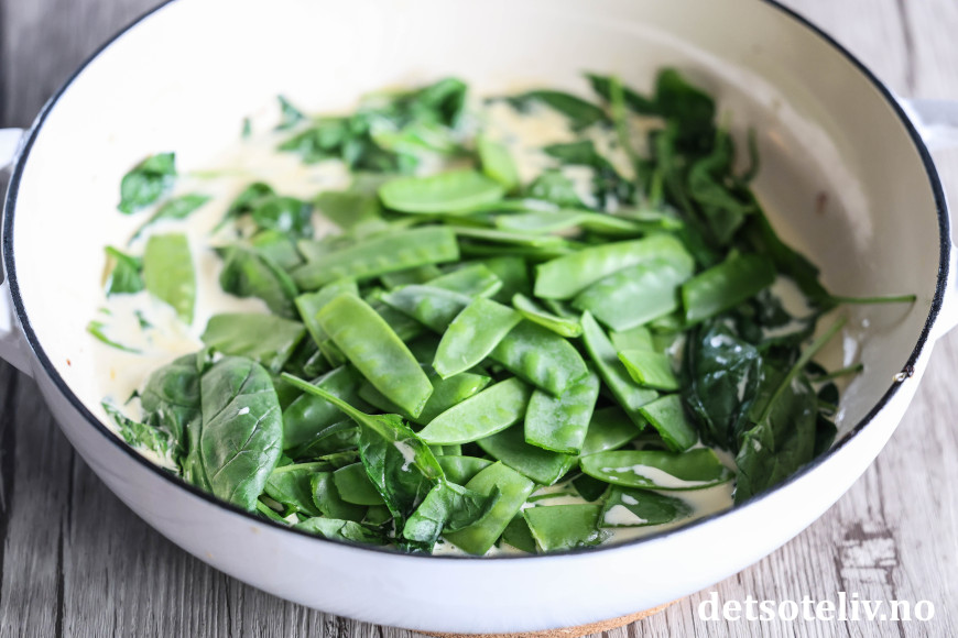 Hell kremfløten i den tømte pannen og sett pannen tilbake på varmen. Legg spinatbladene i pannen. Spinaten vil klappe sammen av varmen slik at det etter hvert også blir plass til sukkerertene.