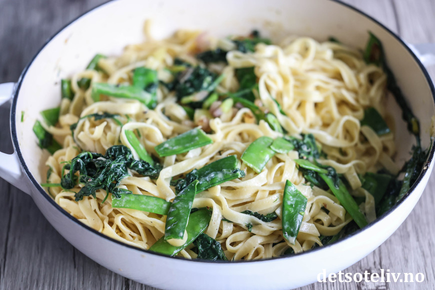 Når det er ca. 1 minutt igjen før pastaen er ferdig kokt (al dente), løftes pastaen ut av kokevannet og over i pannen. Vend om og tilsett også ca. 0,5 dl av pastavannet.