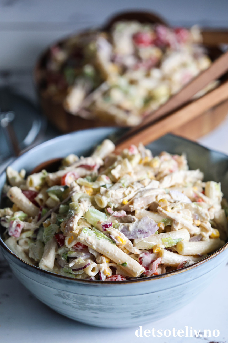 Oppskriften gir en stor porsjon pastasalat, men du skal se at den kommer til å forsvinne raskt! 😋