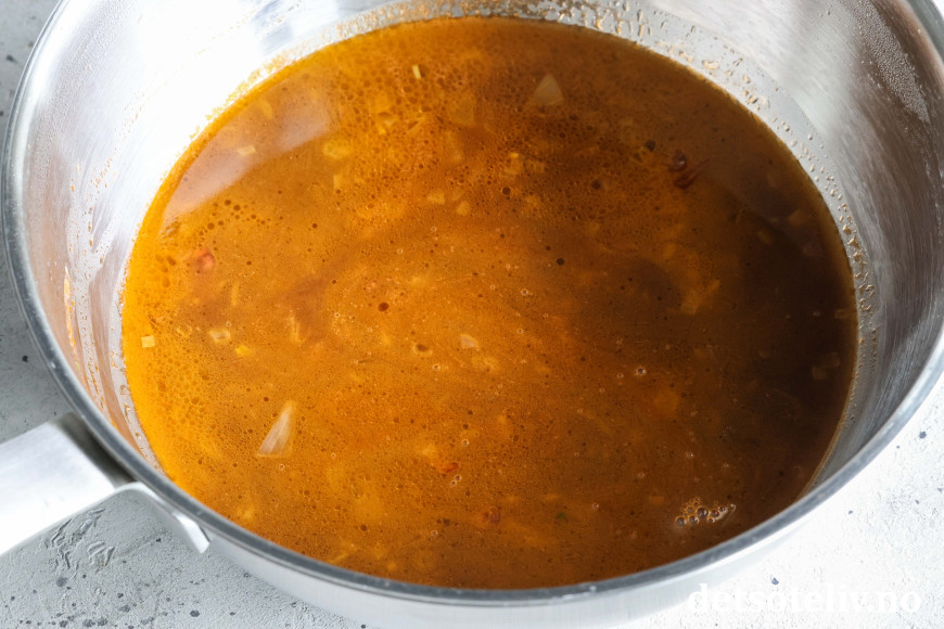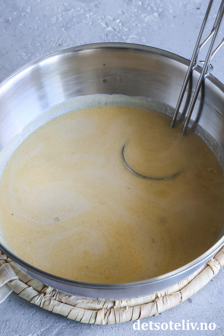 La sausen småkoke i 10–15 minutter. Visp i den av og til. Du vil merke at den vil bli litt tykkere i konsistensen etter hvert.