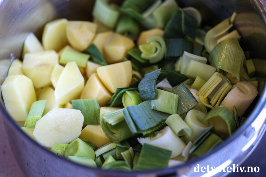 Ha både potetbitene og purreløken i en kjele.