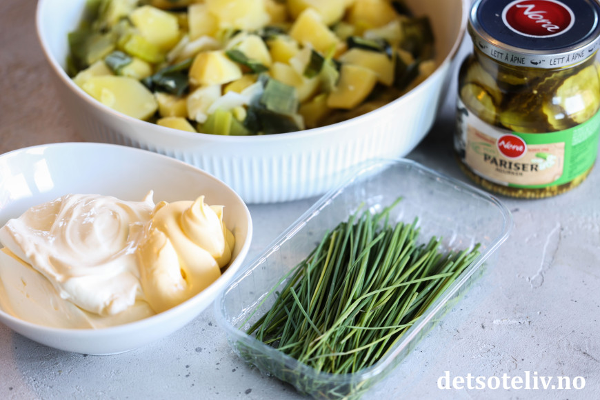 Jeg koker purre sammen med potetbitene, som gjør at purren blir myk og mild på smak, mens jeg tilsetter gressløken rå. Potetsalaten blir kremet av dressingen som består av rømme og majones, hakket sylteagurk og salt og pepper. Jeg vender potetbitene sammen med dressingen mens potetbitene er varme, som gjør at rømmedressingen nærmest smelter litt sammen med potetene.