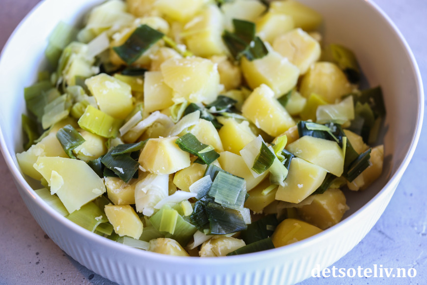 Tilsett vann og kok potet- og purrebitene på middels varme i ca. 5 - 10 minutter, eller til potetbitene er møre. Hell av vannet og ha potet- og purrebitene i en stor bolle.
