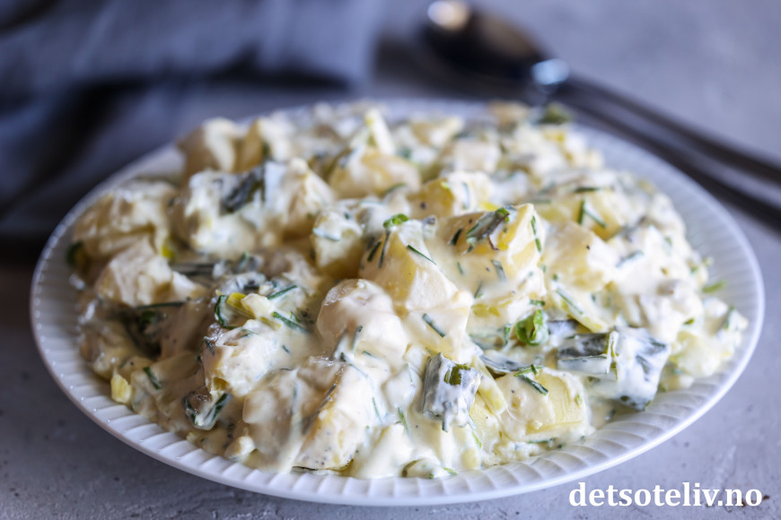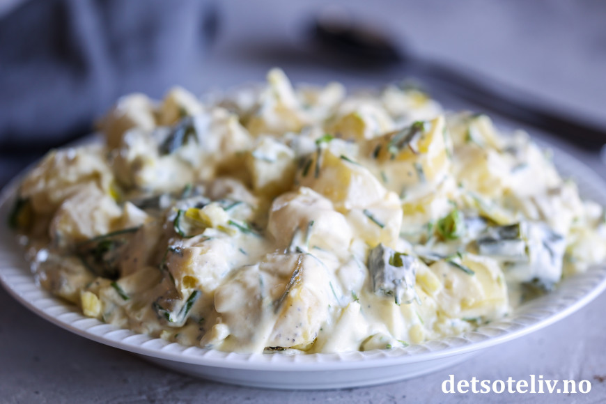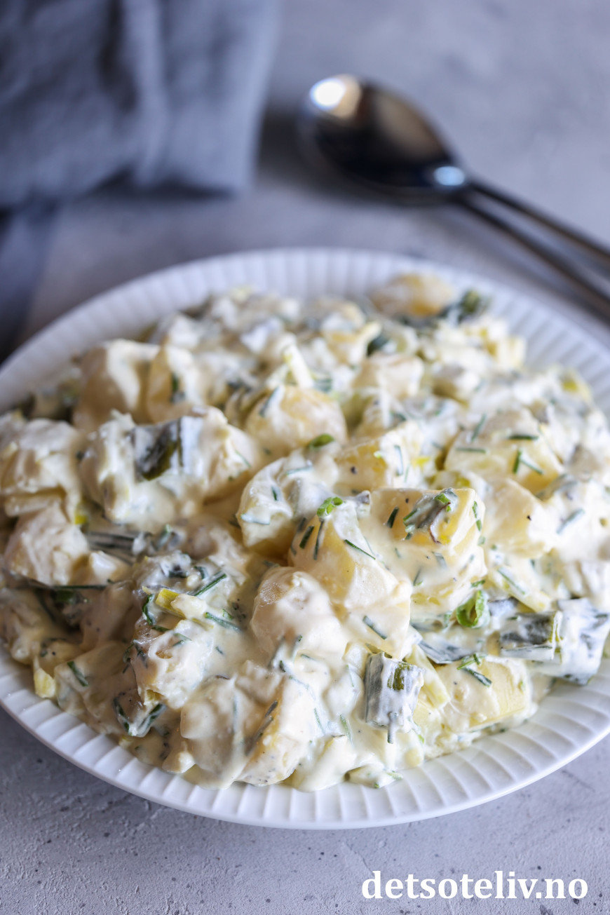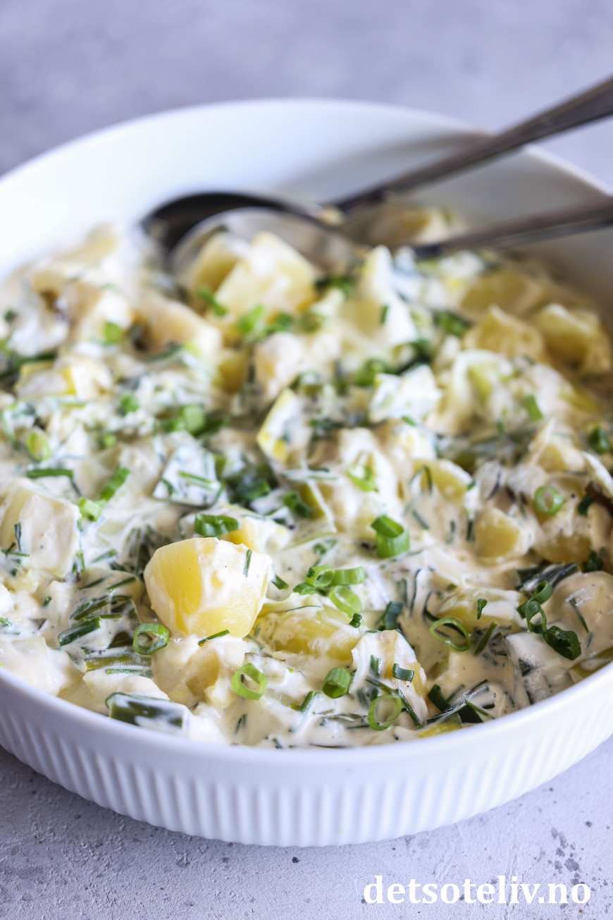 Nydelig, kremet potetsalat med purre og gressløk, som jeg virkelig kan anbefale!