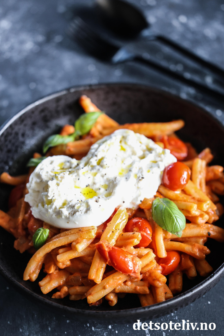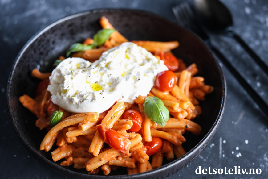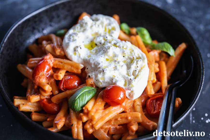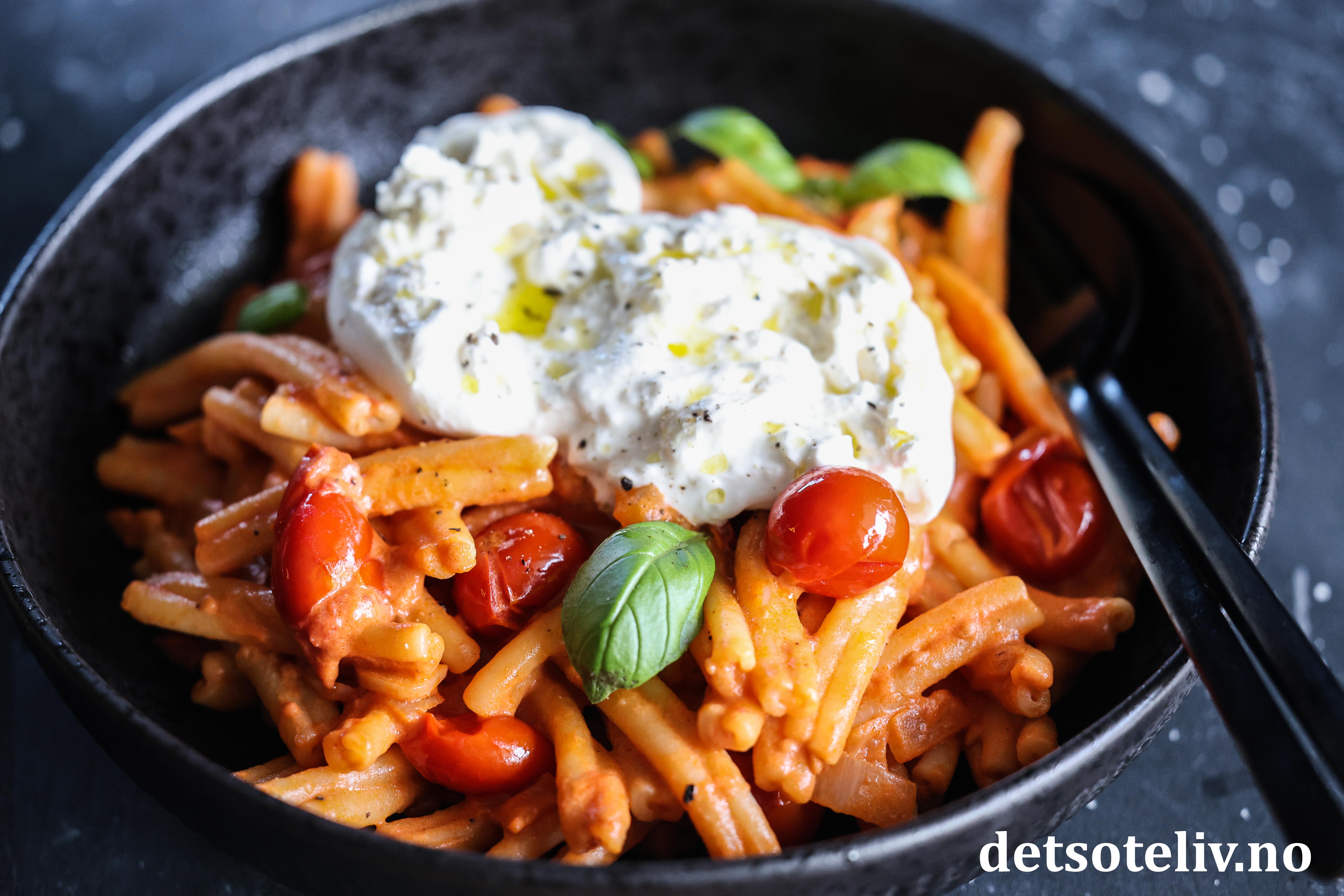 Pasta blandes med en nydelig tomatsaus som tilsettes en god skvett kremfløte. Tomatpastaen toppes med deilig burrata, olivenolje og basilikum.