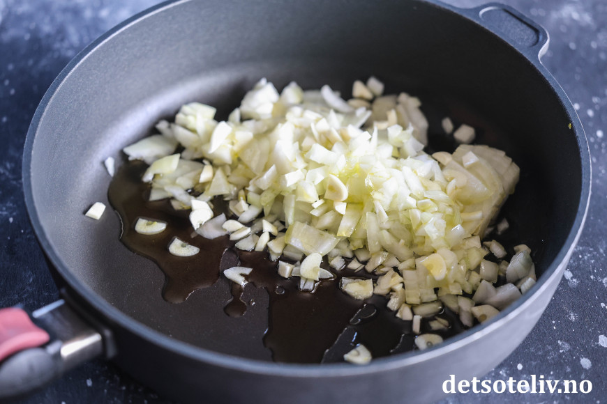 Finhakk løk og hvitløksfedd og ha i en stekepanne sammen med olivenolje.
