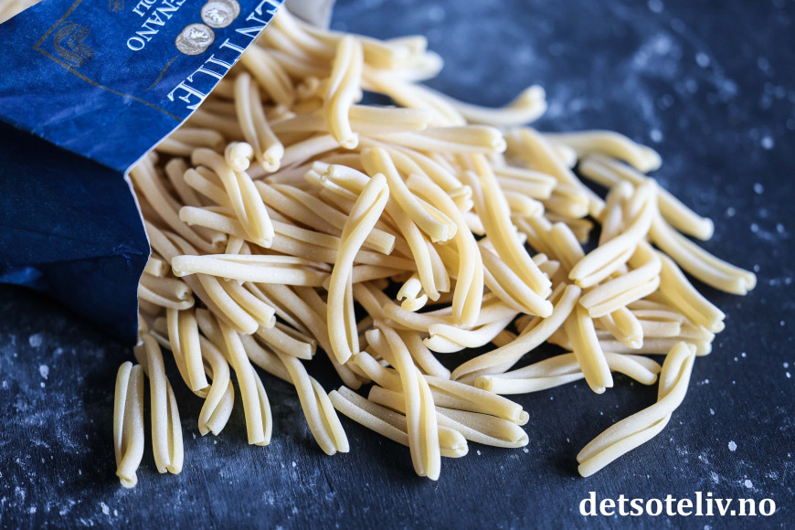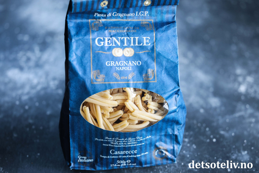 Du kan lage denne retten med alle varianter av pasta. Jeg har her brukt Casarecce (som betyr "hjemmelaget" på italiensk) som er korte, rullede og lett vridde pastastenger. Casarecce stammer opprinnelig fra Sicilia, men brukes mye i hele den sørlige delen av Italia.