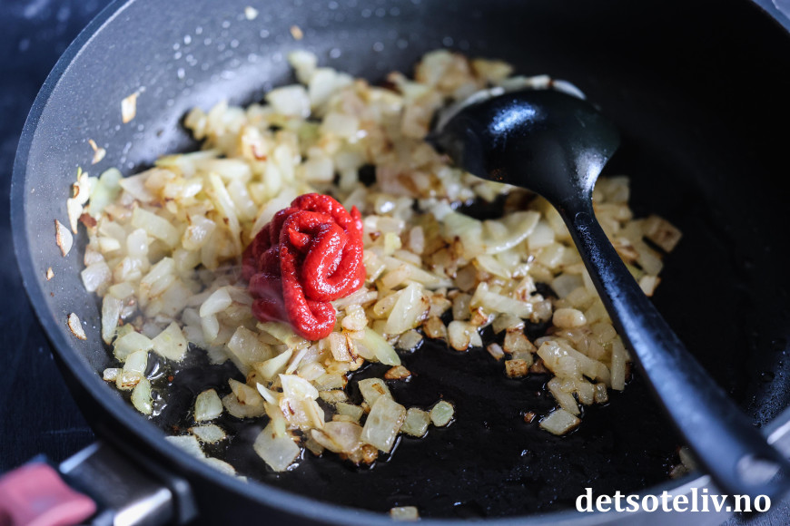 Stek løken på middels varme i noen minutter til den blir blank og gyllen. Tilsett tomatpuré.