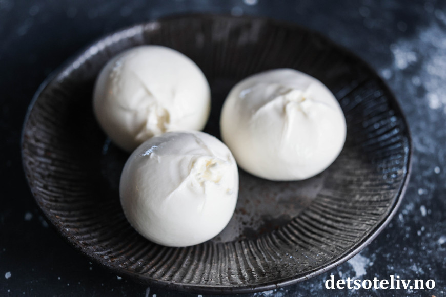 ♥ Burrata er en italiensk ferskost som består av fast mozzarella som fylles med en kremete ostemasse som lages av revet, fersk mozzarella og fløte (fyllet kalles for "stracciatella"). På samme måte som fersk mozzarella, ligger burrata i saltet vann når du kjøper den. Jeg er så glad i ost og bruker 1 hel burrata per porsjon, men en halv burrata per porsjon går også fint. 😊