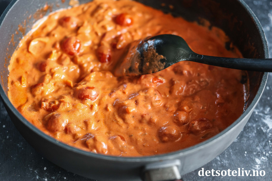 La tomatsausen småkoke i et par minutter før du tilsetter kremfløten.