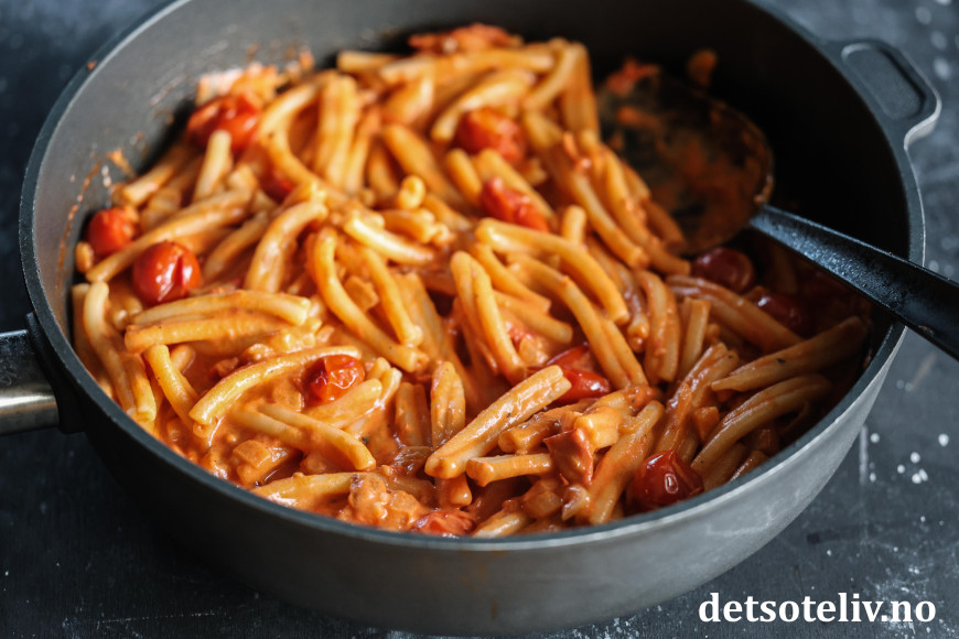 ♥ Ved å koke pastaen i tomatsausen de siste par minuttene, får pastaen ekstra god smak og sausen fester seg bedre til pastaen. Husk alltid å spare på vannet som pastaen er kokt i slik at du kan justere tykkelsen på tomatsausen med pastavann etter behov. Siden det er stivelse i pastavannet fra kokingen av pastaen, vil pastavannet bidra til at sausen får bedre konsistens enn om du sper den ut med bare vann.