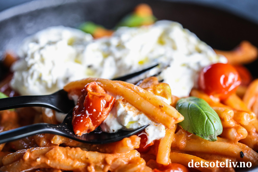 Deilig å kombinere den varme tomatpastaen med den kalde, kremete burrataosten! 😍
